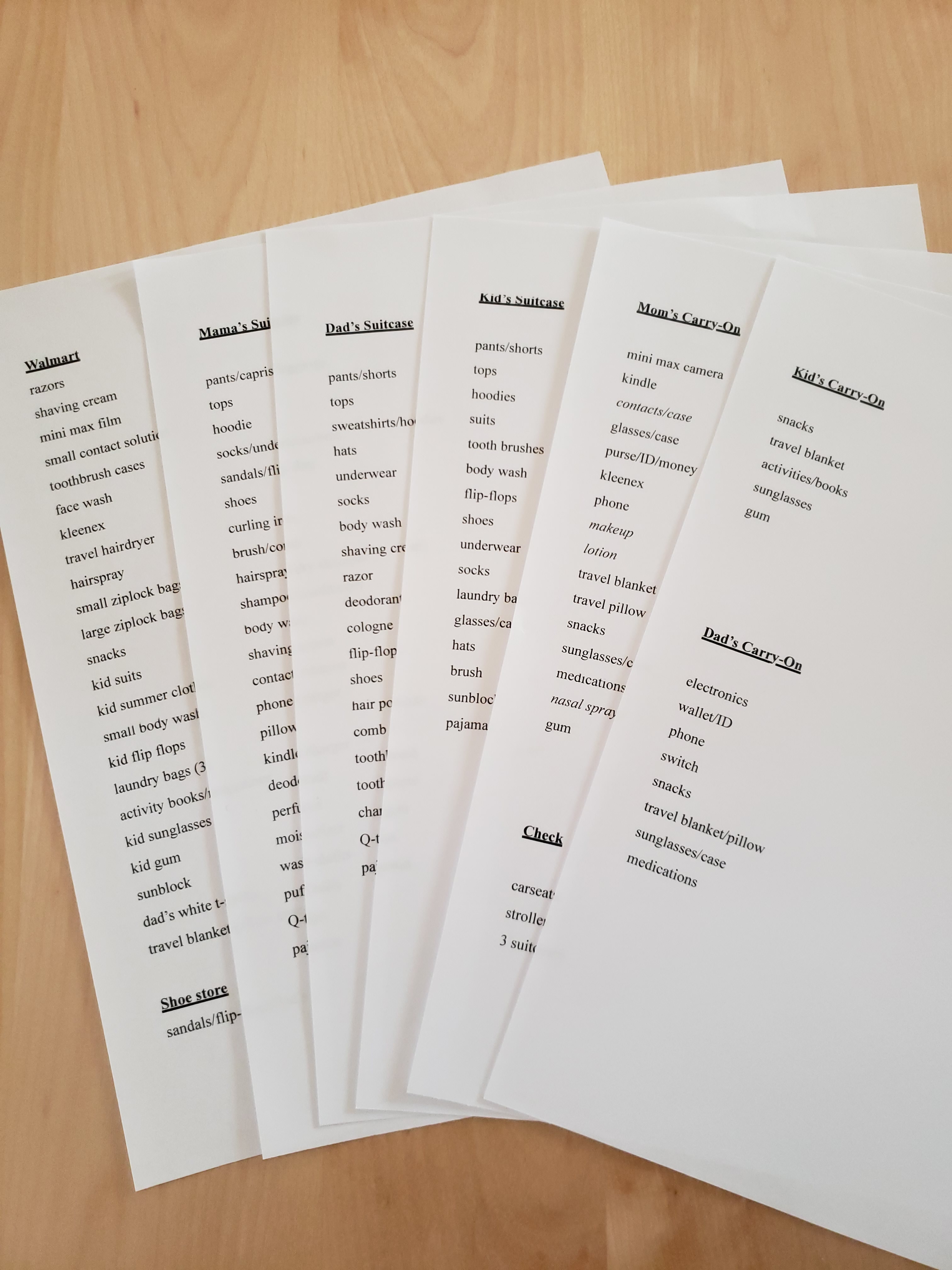 I will make a checklist of everything that needs to be packed into each suitcase, carry-on, diaper bag, and purse. I do this weeks before in case I need to go shopping for certain things and I always end up updating the list when I remember something I previously left out. I do tend to overpack but I’m always thankful for it. My husband is the opposite. He’ll throw a handful of clothes into a bag the morning we leave for any trip and then we end up spending part of our vacation at Walmart picking up all of the things he forgot. I think he does this on purpose because he’d rather buy new things than do laundry and he’s somewhat of a shop-o-holic. He’ll try to justify it by saying, “It’s just a five dollar T-shirt, blah, blah, blah…” Yes, but you have 300 crappy five dollar T-shirts already!