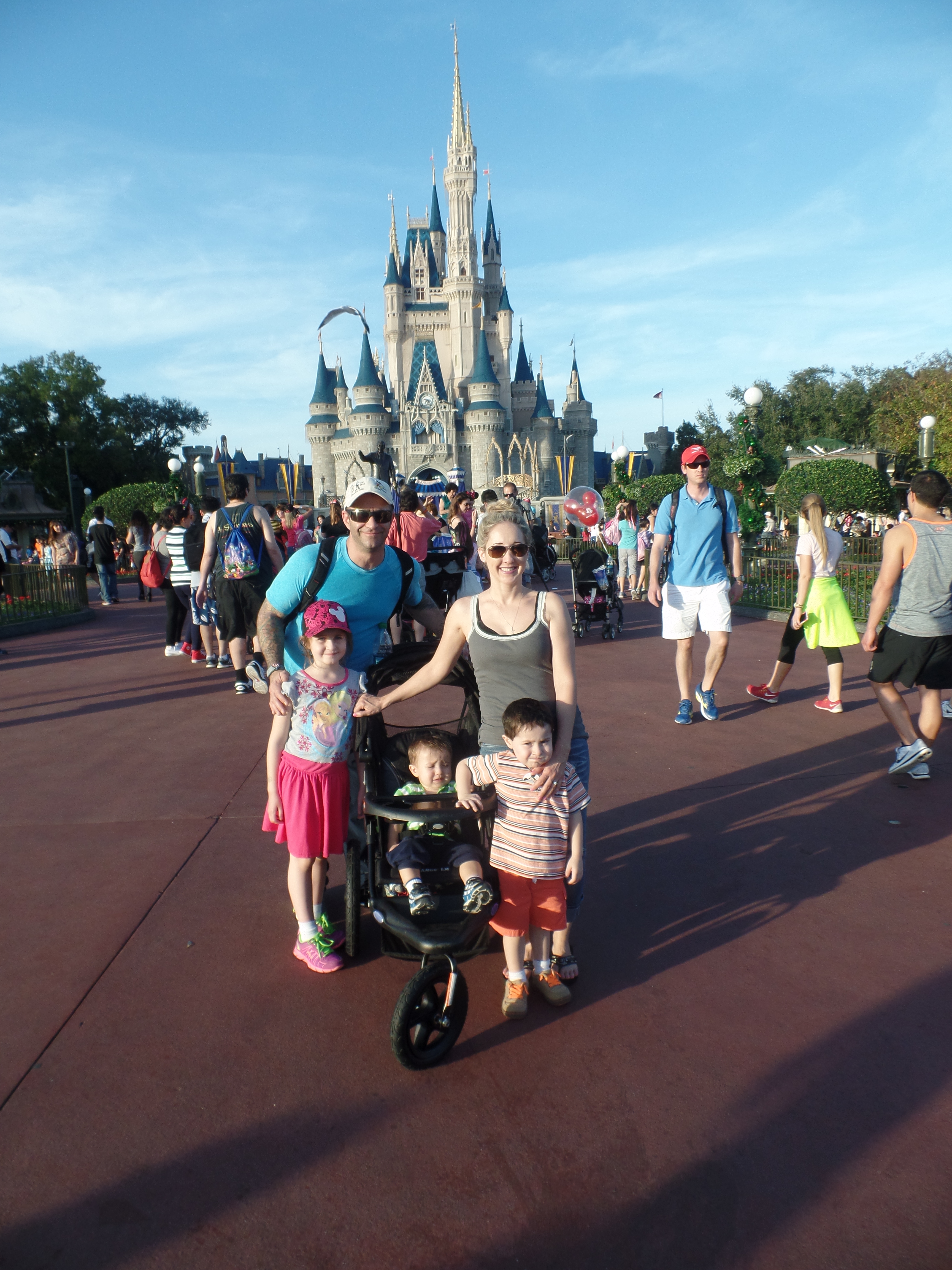 The stroller that worked the best for my crew was the Baby Trend Sit N’ Stand stroller. It was great for rolling through the Disney parks, too. At the airport, my eldest walked, my toddler sat on the back seat, and all of our carry-ons were shoved into the front seat and the net underneath. I wore my baby in a Tula baby carrier. It was a lovely little set up…until we had to take everything out to go through the x-ray machines.